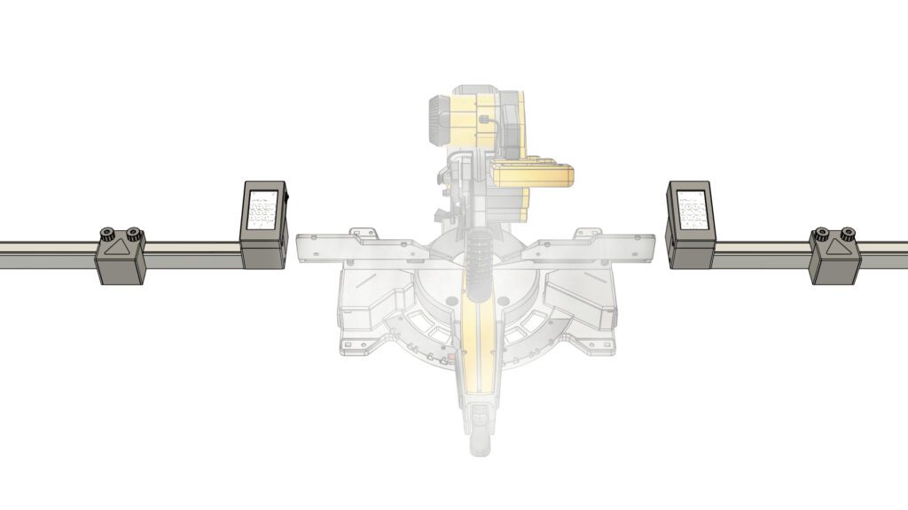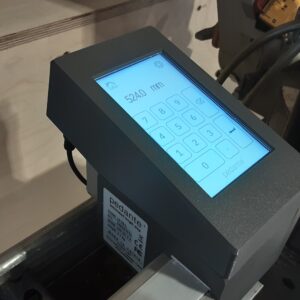 It is a miter saw fence with an integrated stop block. It mounts on either side of the saw, runs on a 24 V system, and uses a precision timing belt driven by a stepper motor. On the touchscreen, you enter a length and press Enter; the motorised stop moves automatically to that exact position and keeps it in place. The system is built for consistent cuts, quick setup, and hard-use workshop environments.