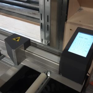 The system is designed for intensive daily use in a production environment. It uses an industrial-grade touchscreen, a 25 mm wide timing belt with steel cords, a 40×45 mm specially designed aluminium profile, and a stepper motor sized for continuous positioning and holding.