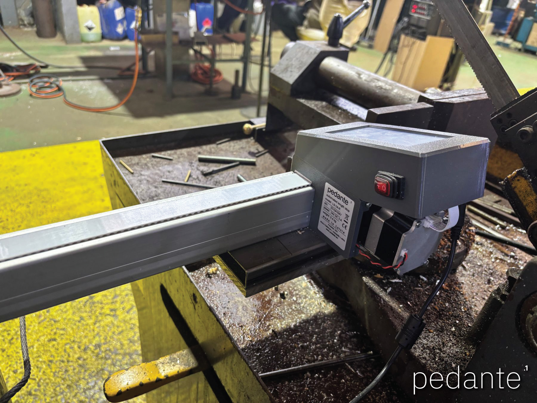 The stop block is driven by a stepper motor via a timing belt. It is not moved by hand. Enter the required length on the touchscreen and the stop moves automatically to that position.