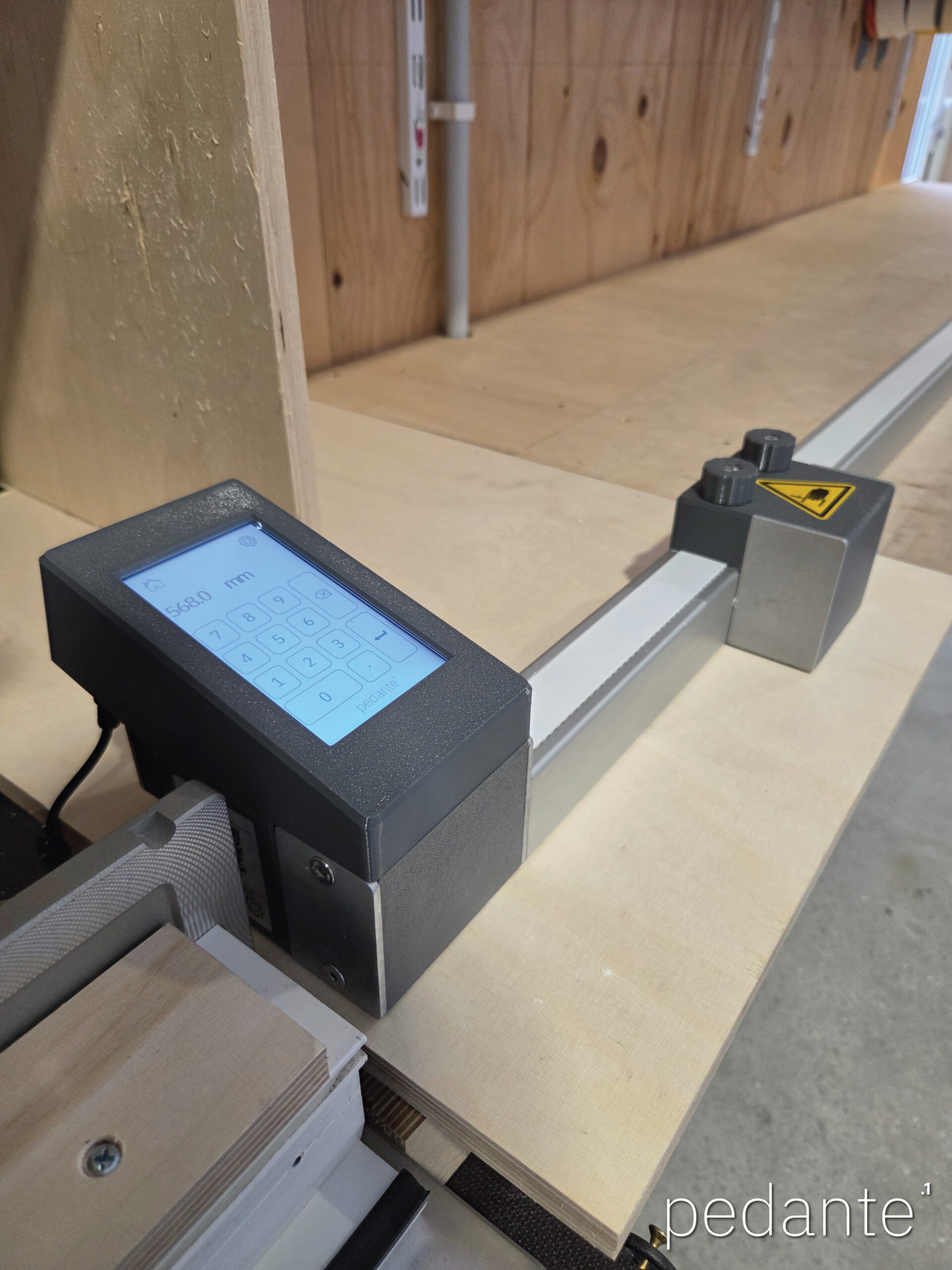 All functions are controlled from the display: enter length, run homing, switch units, calibrate. The screen works with gloves, in dusty conditions, and remains readable in bright light.