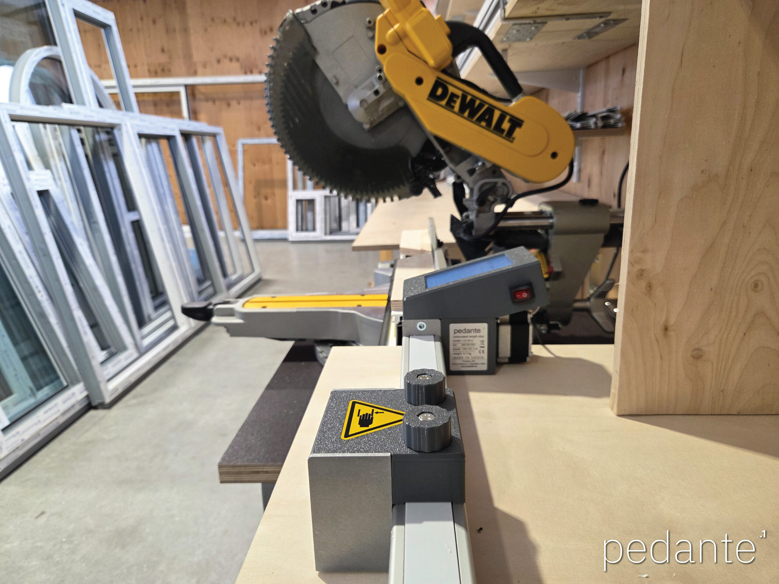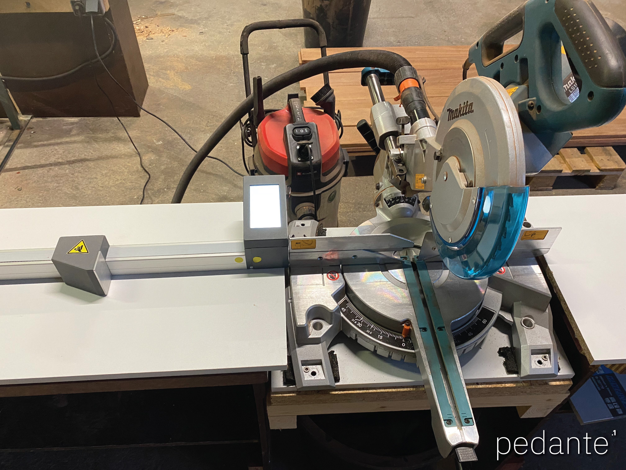 It is used to set repeatable cut lengths on a miter or chop saw. Instead of measuring and locking a manual stop every time, you enter a value and the stop moves there automatically. This saves time and reduces measuring errors when cutting multiple identical parts.