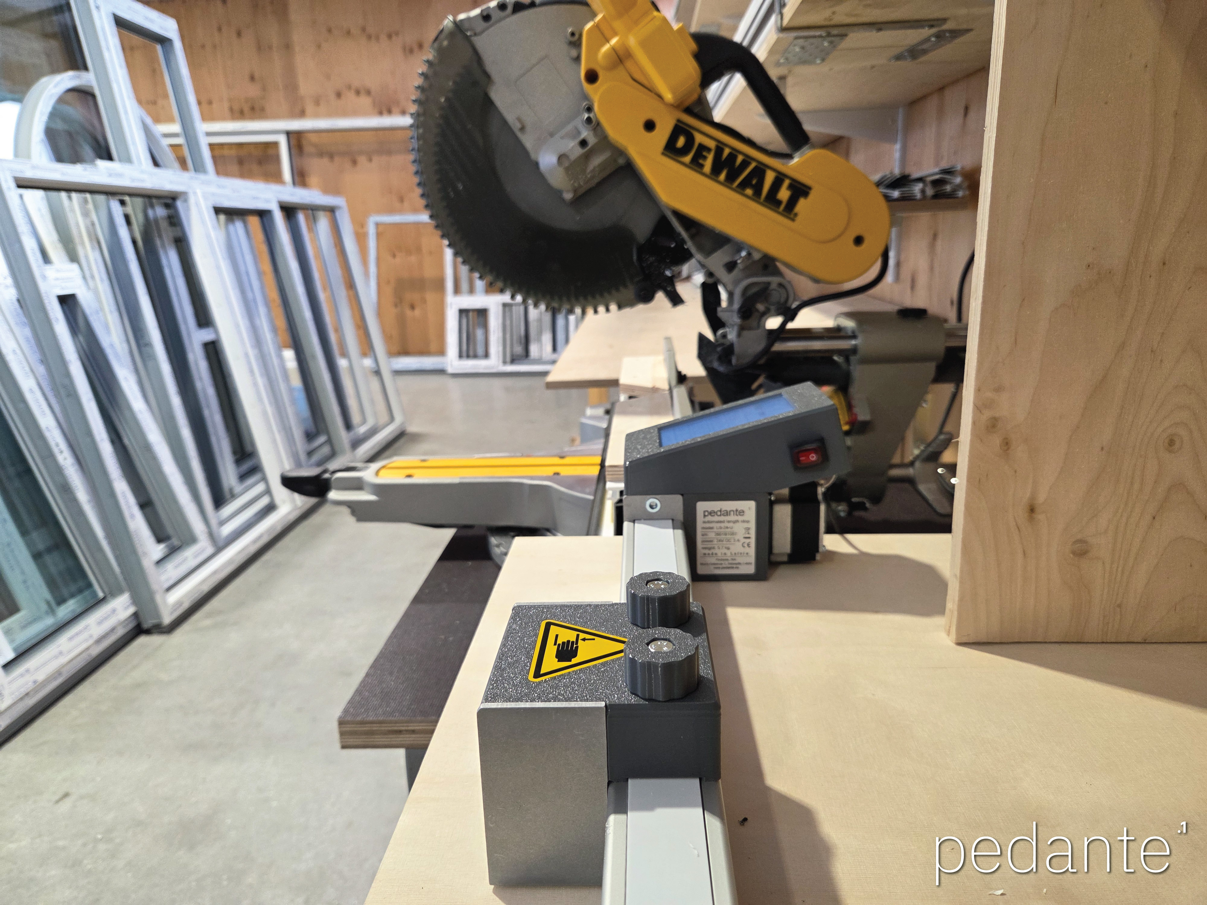 Serve per impostare lunghezze di taglio ripetibili su una troncatrice o sega a taglio. Invece di misurare e bloccare ogni volta una battuta manuale, si inserisce un valore e la battuta si sposta automaticamente in quella posizione. Questo fa risparmiare tempo e riduce gli errori di misura quando si tagliano più pezzi identici.